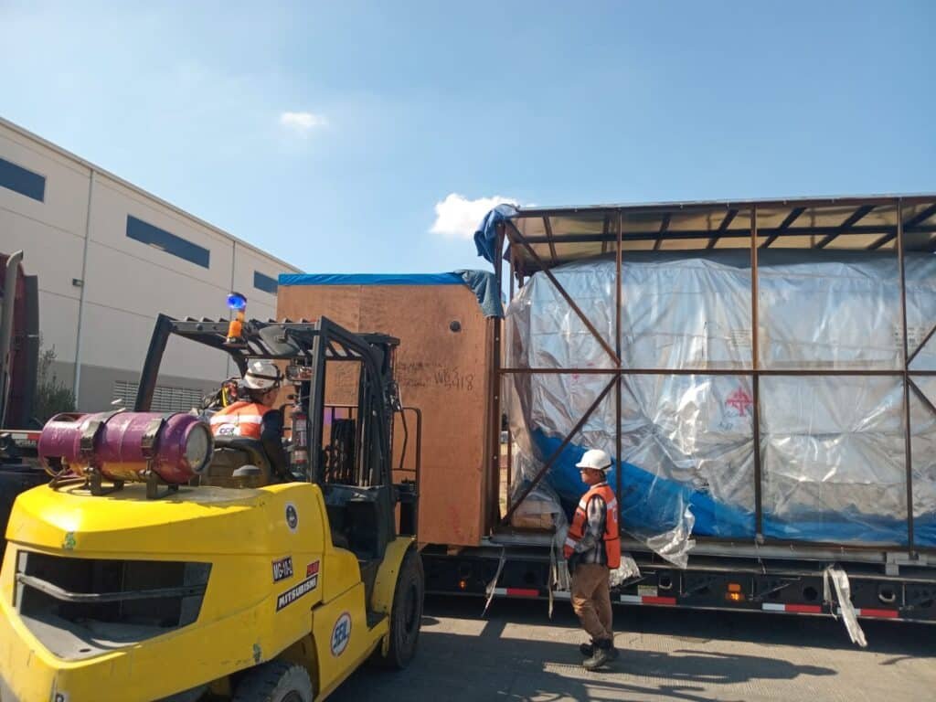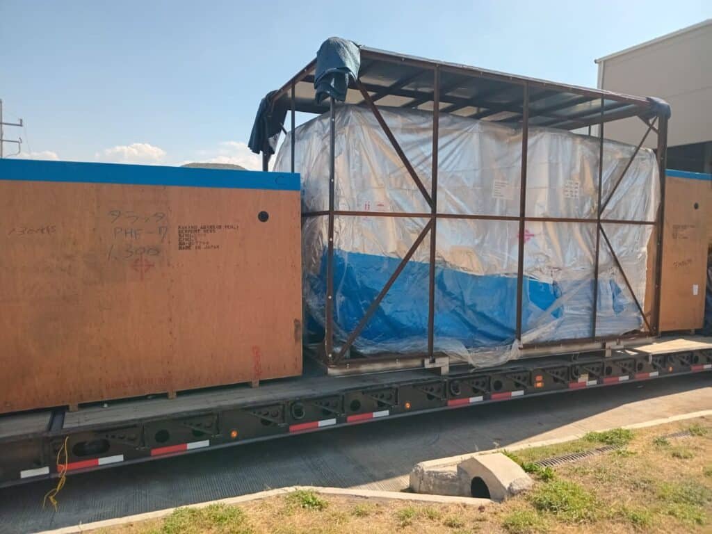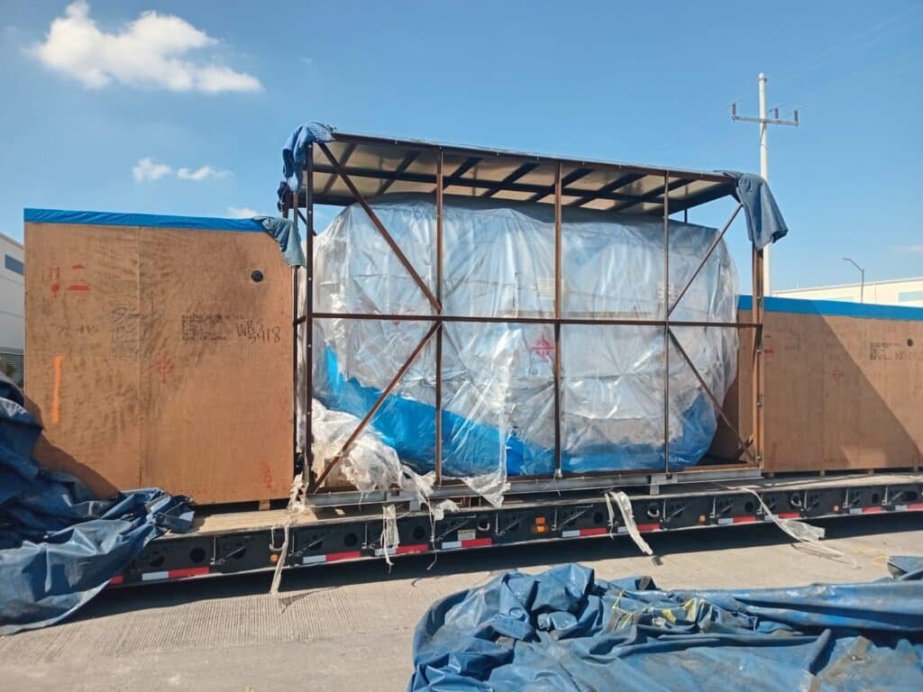 En la siguiente imagen, se puede apreciar la escala. La maquinaria viene protegida meticulosamente con lonas y, lo que es más importante, con cubiertas de polietileno de alta densidad para vácuo (como se ve en imagen 1 e imagen 2) para proteger la sensible electrónica de precisión de la humedad y la corrosión durante el trayecto transoceánico o transcontinental.
