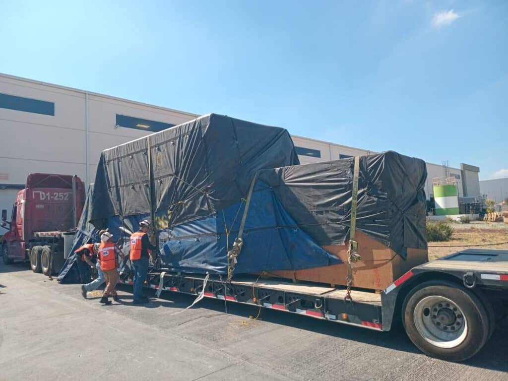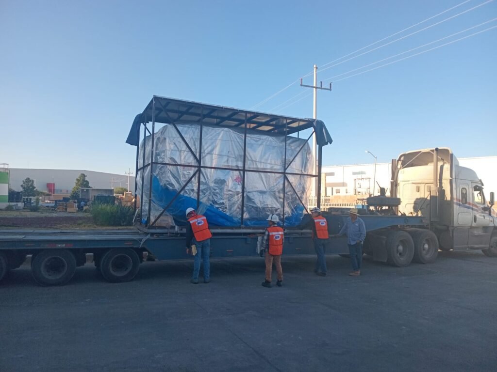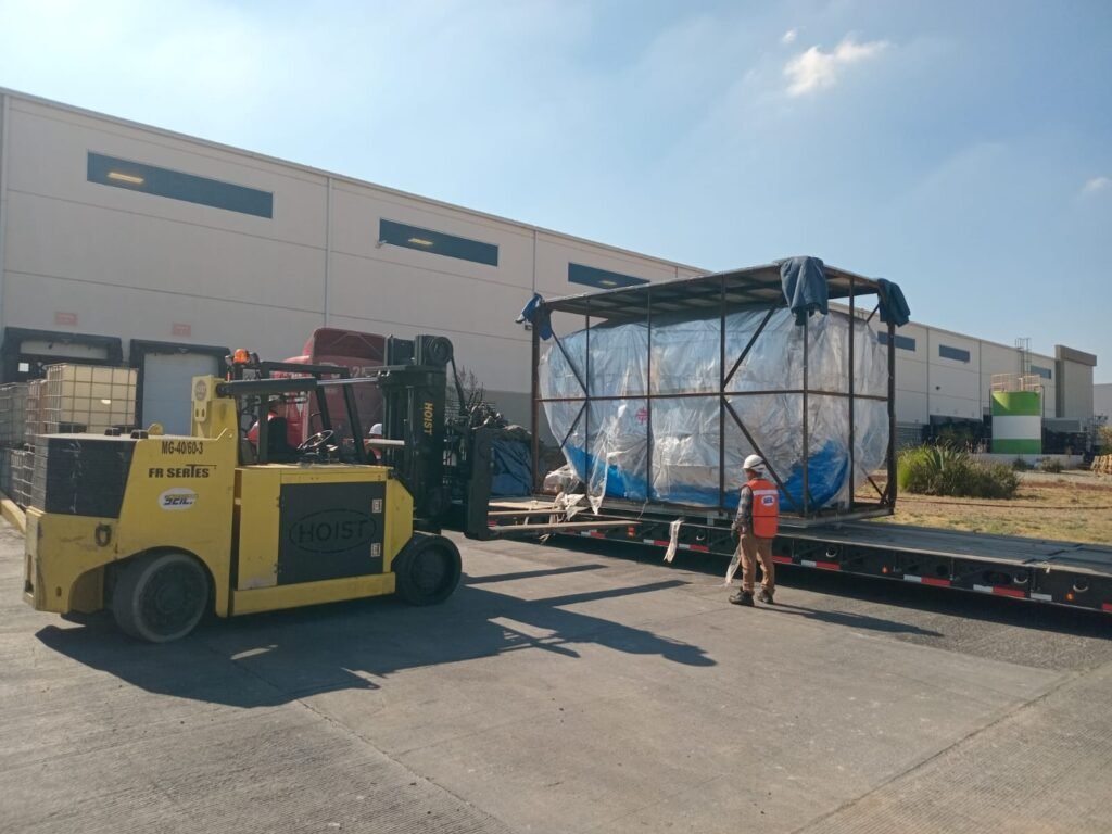 El proyecto comenzó en un día soleado de Saltillo. El envío, un paquete crítico que incluía el cuerpo principal del CNC (más de 18 toneladas en una sola pieza) y varios componentes periféricos, llegó a bordo de un remolque de cama baja (lowboy). Este tipo de remolques son necesarios no solo por el peso, sino por la altura del equipo, manteniendo el centro de gravedad bajo y cumpliendo con las regulaciones de transporte.