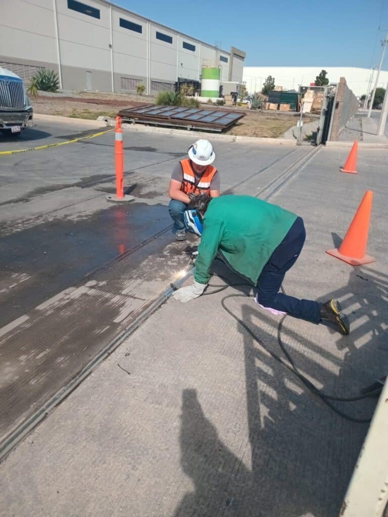 Las vías de rodamiento o guías en el suelo son cruciales para el movimiento y la precisión de la máquina. En las imagenes 8, 9 y 10, vemos a dos de nuestros soldadores altamente calificados. El soldador del equipo SEIL, con su equipo de seguridad completo (careta de soldar, guantes, chaqueta de protección), realiza una soldadura industrial de precisión en las guías del suelo. Esta soldadura asegura la estabilidad a largo plazo y la capacidad de carga.