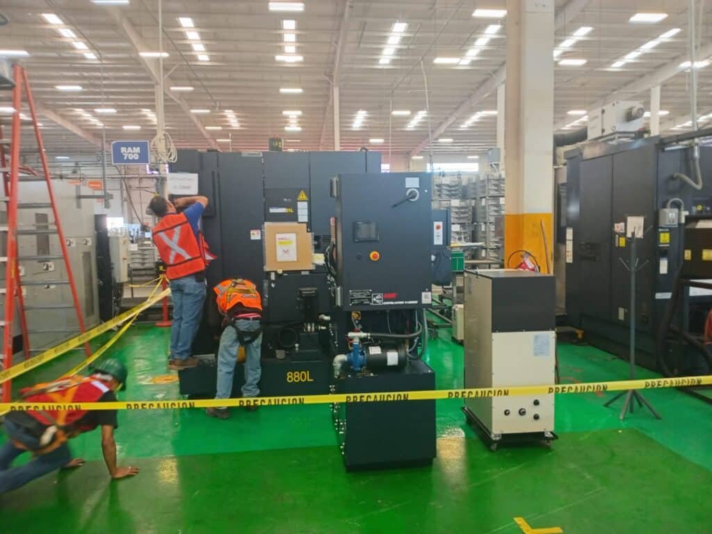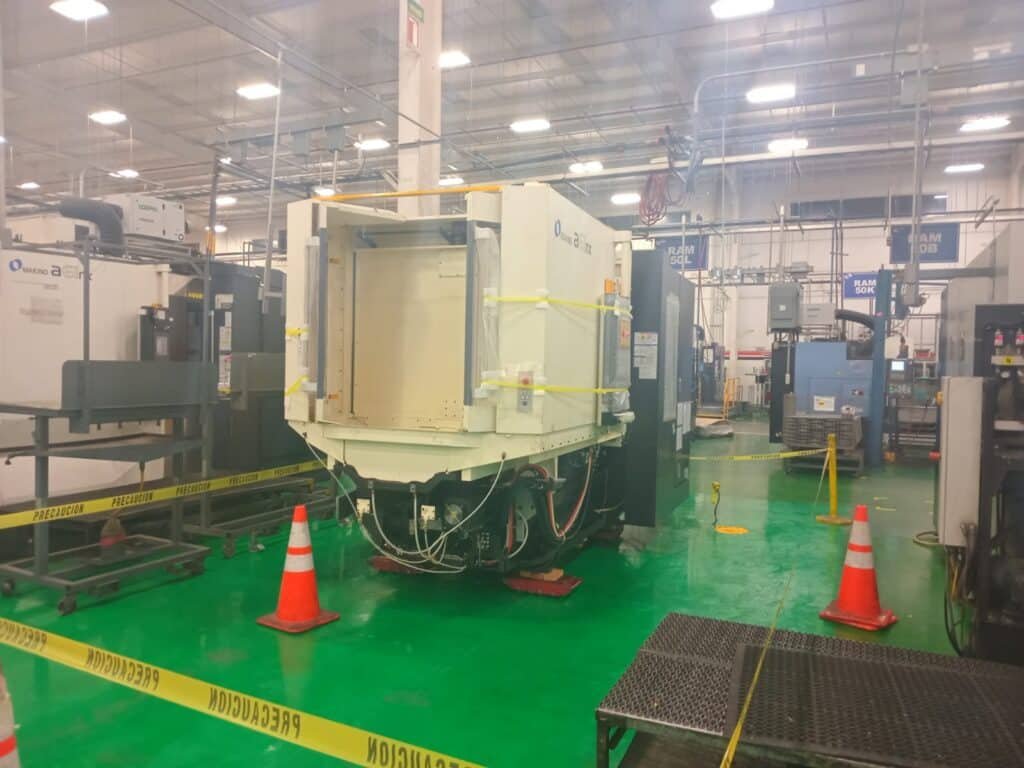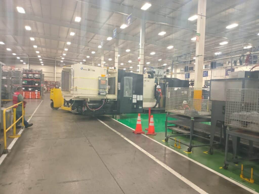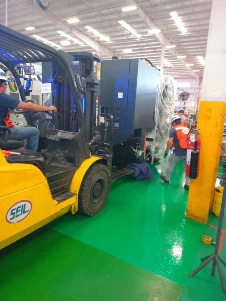 La Maniobra: En la imagen 5, 6, 7 y 8, la máquina ya se encuentra dentro de la planta, y podemos ver a nuestro equipo en acción alrededor de una máquina CNC 880L. Aquí es donde la experiencia de SEIL (mecánica de precisión industrial) entra en juego. No basta con mover la carga; hay que entender cómo interactúa con el entorno de producción existente. Fíjense en la cinta amarilla de precaución que delimita el área de trabajo y el uso constante de equipo de protección personal (EPP) por parte de nuestro personal. La seguridad es innegociable.